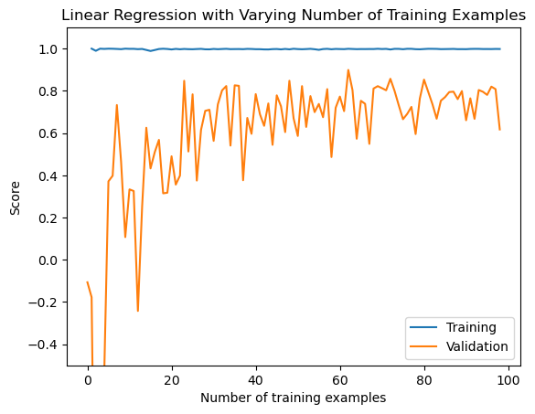 labels = plt.gca().set(xlabel = "Number of training examples", ylabel = "Score", title = "Linear Regression with Varying Number of Training Examples")/Users/zayn/opt/anaconda3/envs/ml-0451/lib/python3.9/site-packages/sklearn/linear_model/_coordinate_descent.py:634: ConvergenceWarning: Objective did not converge. You might want to increase the number of iterations, check the scale of the features or consider increasing regularisation. Duality gap: 0.000e+00, tolerance: 0.000e+00