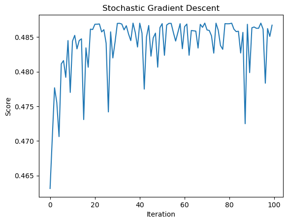 labels = plt.gca().set(xlabel = "Iteration", ylabel = "Score", title = "Stochastic Gradient Descent")
