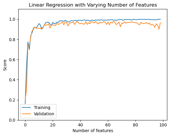 We see a sharp increase in training and validation scores as the number of features increase. After the features reach 5, both the scores on average plateau, also the training score is mostly constitently slightly higher than the validation score. As we reach really high number of features, the training validation approaches 100% while the validation slowly starts decreasing which means the model has started overfitting. The validation score would decrease faster, however the stochastic gradient descent slows down the process.